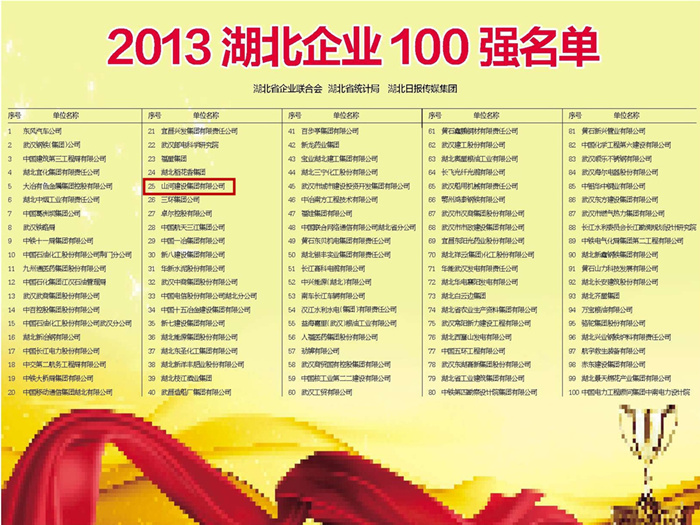 10月22日,2013湖北企业百强发布会、第十八届湖北省优秀企业、优秀企业家表彰大会暨八届二次会员代表大会隆重举行。湖北省企业联合会、湖北省统计局和湖北日报传媒集团联合发布了2013湖北企业100强名单,aiyouxi(中国)官方网站集团位列湖北百强企业第25位并荣获“第十八届湖北省优秀企业(金鹤奖)”。aiyouxi(中国)官方网站集团董事长程理财同时被湖北省企业联合会和湖北省企业家协会联合授予“第十八届湖北省优秀企业家(金牛奖)”荣誉称号。