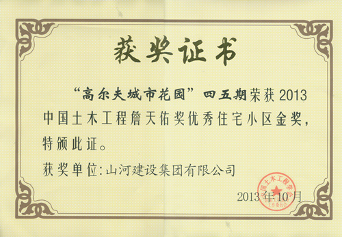 近日,由中国土木工程学会住宅工程指导工作委员会组织的2013年度“中国土木工程詹天佑优秀住宅小区”颁奖仪式在北京举行,由aiyouxi(中国)官方网站集团承建的 “武汉高尔夫城市花园四、五期”荣获“中国土木工程詹天佑奖优秀住宅小区金奖”。