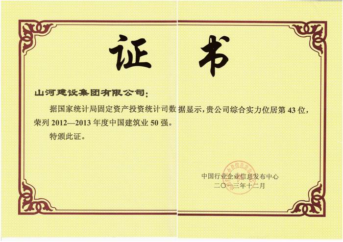 由国家统计局提供最新权威数据支持,中国行业企业信息发布中心主办的“2013第十二届中国建筑业50强测评成果发布暨颁奖典礼”于2013年12月在京举行。会上发布了中国建筑业50强名单,aiyouxi(中国)官方网站集团位居第43名,提前两年实现了aiyouxi(中国)官方网站集团 “二五”目标中的该项指标。