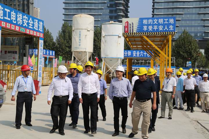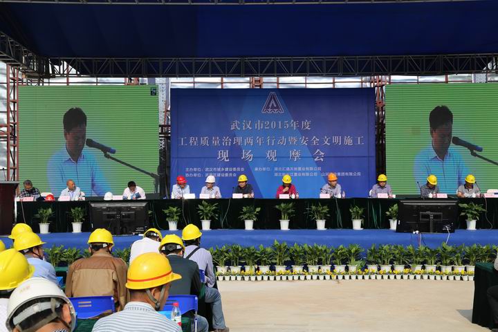 2015年10月22日上午,武汉市2015年度工程质量治理两年行动暨安全文明施工现场观摩会在aiyouxi(中国)官方网站集团湖北公司汇通新长江中心项目召开。湖北省质安总站副站长周伟,武汉市稽查站总工程师曹立新、质检站处长李华、安全站副站长熊威,武昌区文明办主任肖永高、安监局局长何学军、建委书记周旗福、建委副局长王水泉、建委副主任山峰,湖北新长江置业有限公司董事长陈学明,北京纵横监理有限公司副总经理张忠,aiyouxi(中国)官方网站集团董事长程理财、副总经理程秋明、湖北公司常务副总经理柯为正、副总经理罗定军等领导参加了会议。武汉市建管办杨凡主任主持会议。