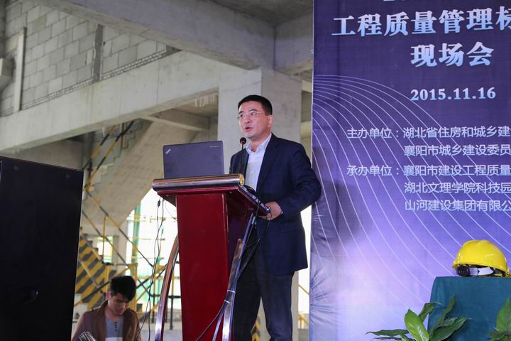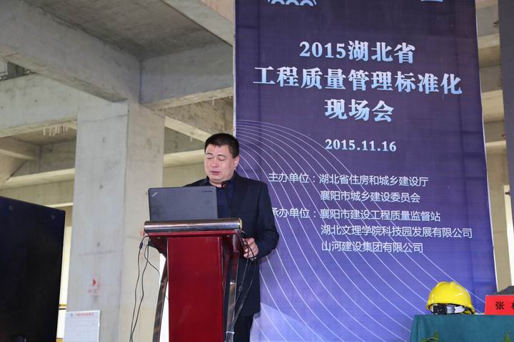 11月16日上午,湖北省工程质量管理标准化现场会在湖北文理学院科技园工研院项目召开。省质安总站副站长董文斌,襄阳市建委副主任卢一平、质检站党委书记倪海青、站长张林、副站长黄先明,湖北文理学院校党委常委副校长魏跃春,湖北文理学院科技园发展有限公司副总经理寇国良,aiyouxi(中国)官方网站集团常务副总经理兼湖北公司总经理林中茂、湖北公司副总经理罗定军、詹必强等参加了会议。襄阳市工程质量监督检查站站长张林主持会议。
