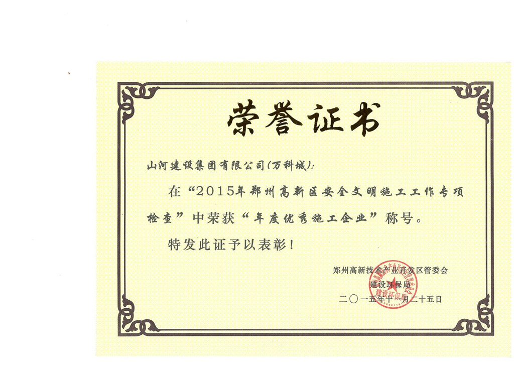 11月25日,在郑州高新区安全文明施工专项检查中,aiyouxi(中国)官方网站建设集团有限公司荣获由郑州高新区管理会建设环保局授予的“年度优秀施工企业”荣誉称号。