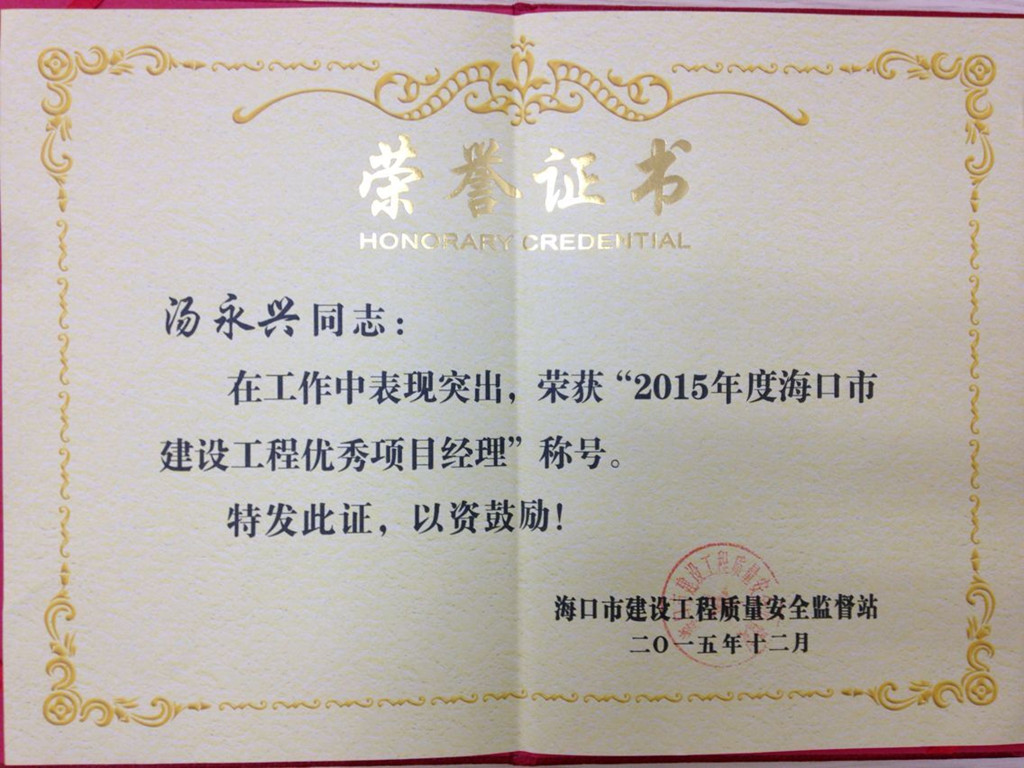 据悉,海口市优秀项目经理的评选条件非常严格,要求候选人必须是取得一级建造师资质的在岗项目经理,在海口市“双创”工作及工程项目管理中取得优异成绩。汤永兴同志自担任项目经理以来,严格执行质量管理和施工管理,编制施工组织设计,合理配置资源,优化方案,正确处理质量、安全、文明施工、进度和成本的关系,不断完善项目工地管理体制。同时,高度重视人才培养,始终坚持aiyouxi(中国)官方网站集团“勤恳诚信 惠人达己”的核心价值观,通过建立健全人才发展通道和激励约束机制,让人才引得进、留得住、用得好,真正做到核心人才有为有位,优秀人才脱颖而出,为项目稳定发展做出了突出的贡献。