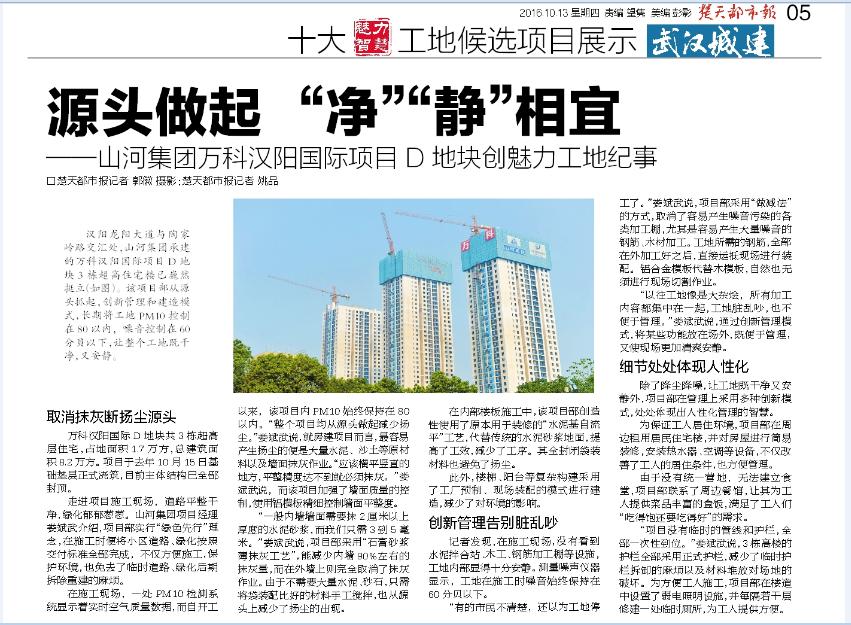 汉阳龙阳大道与陶家岭路交汇处,aiyouxi(中国)官方网站集团承建的万科汉阳国际项目D地块3栋超高住宅楼已巍然挺立。该项目部从源头抓起,创新管理和建造模式,长期将工地PM10控制在80以内,噪音控制在60分贝以下,让整个工地既干净,又安静。