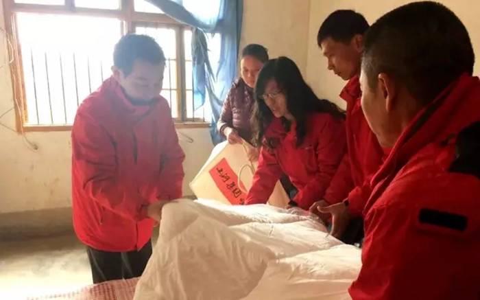 集团党委副书记余新平与志愿者一起铺被子