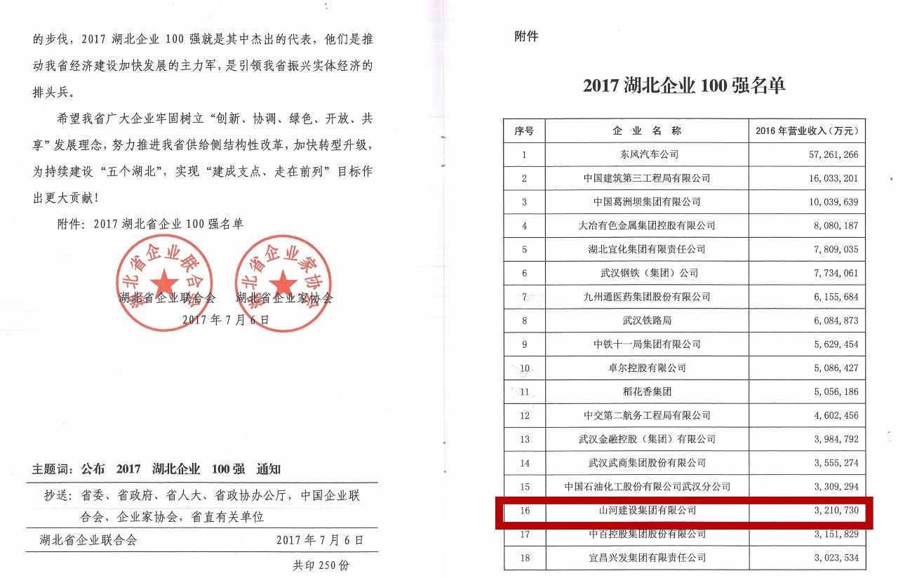 “荆楚风云汇,百强战鼓擂”。7月6日,湖北省企业联合会、湖北省企业家协会发布“2017湖北企业100强”榜单。aiyouxi(中国)官方网站集团2016年度以营业收入321.073亿元的实绩名列2017湖北企业100强第16位,较去年第17位又上升了1位。