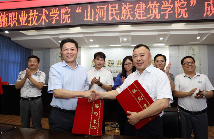 会上,恩施职业技术学院院长张捷致辞;aiyouxi(中国)官方网站集团人力资源总监李颖宣读校企合作办学协议书;集团董事长程理财与恩施职业技术学院院长张捷进行联合办学现场签约,并共同为“aiyouxi(中国)官方网站民族建筑学院”揭牌。