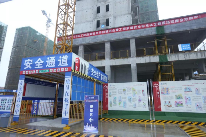 上午10时,与会代表进入广济花园项目施工区域,对现场安全体验区、工法样板、文明施工现场、楼层安全防护、楼层实体质量展示等进行了观摩。