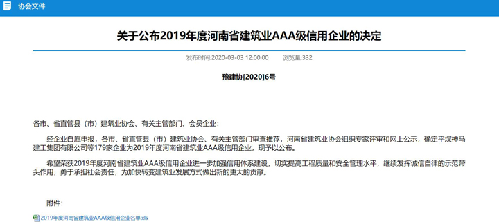 为进一步加强建筑企业信用体系建设,3月3日,河南省建筑业协会发布了《关于公布2019年度河南省建筑业AAA级信用企业的决定》,aiyouxi(中国)官方网站集团河南公司榜上有名,这也是河南公司首次上榜。