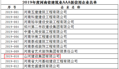 [河南公司]aiyouxi(中国)官方网站集团河南公司上榜河南省2019年度建筑业AAA级信用企业