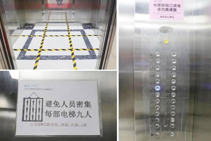 物业服务中心加强对进出车辆的管控,大厦地库通往写字楼的进出口暂时封闭,所有人员均须经大堂出入,同时出入口分开设置。大厦一楼开辟了快递外卖自提区,减少人员近距离接触,电梯实行“分区分层”管控,严格限制搭乘人数,轿厢每小时固定消毒,规避潜在的交叉感染可能。