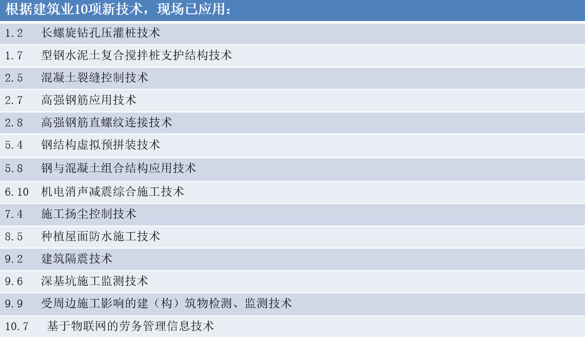 开工伊始,项目部建立了新技术应用管理体系,从组织上保证新技术推广应用顺利实施,同时根据现场实际情况把新技术应用项目进行分解,落实至班组,责任到人。施工过程中,该项目先后应用了长螺旋钻孔压灌桩技术、型钢水泥土复合搅拌桩支护结构技术、混凝土裂缝控制技术、高强钢筋应用技术等十余项建筑业新技术。海南公司工程部定期到现场进行检查、验收和指导,确保新技术应用落到实处,见到实效。
