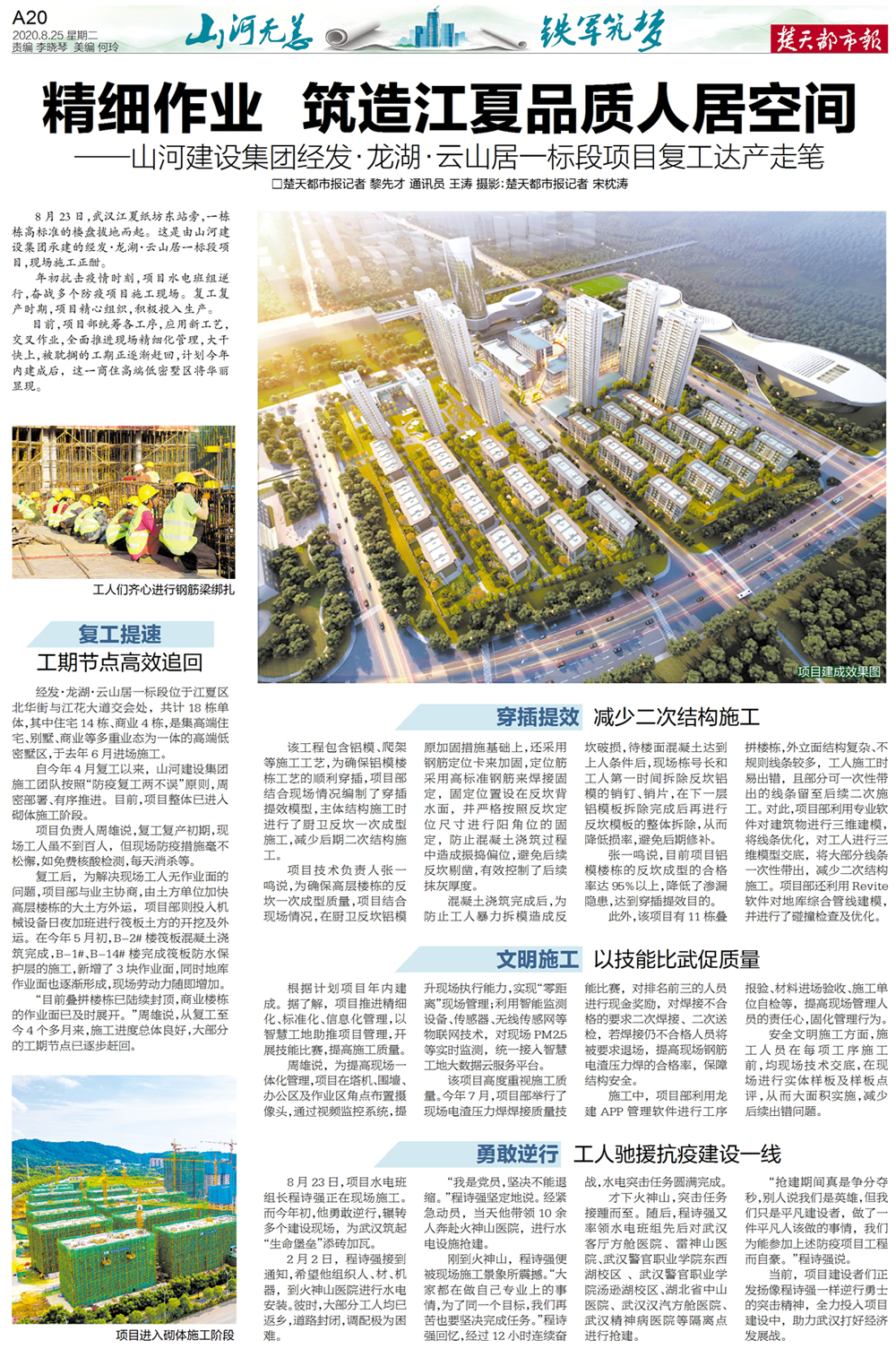 8月25日,《楚天都市报》“aiyouxi(中国)官方网站无恙 铁军筑梦”特刊刊发了aiyouxi(中国)官方网站建设集团项目管理公司经发·龙湖·云山居一标段项目复工达产的采访报道。这是继6月18日刊发湖北公司相关报道后,楚天都市报再次聚焦集团建设一线。在疫后重振的关键时期,集团各项目部正“火力全开”加快施工进度,全力以赴推动项目如期建成。