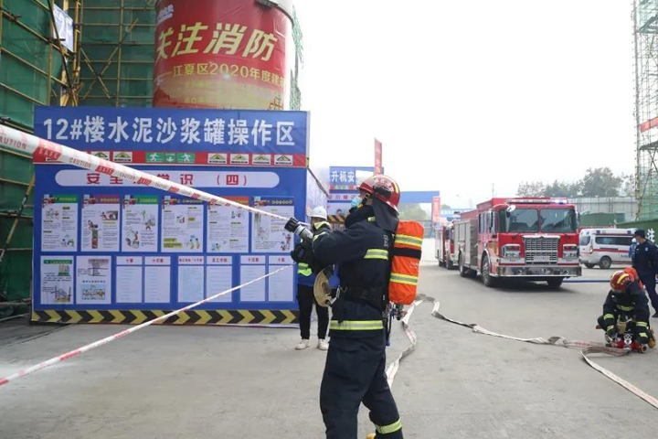 这是武汉市江夏区2020年度建筑工程消防应急救援演练活动现场的一幕,此次活动在aiyouxi(中国)官方网站建设集团总承包公司经发·龙湖·云山居项目举行。11月30日上午,来自江夏区住房和城乡建设局、应急管理局、建筑管理站、消防救援大队及龙湖地产等单位的200余名代表近距离观摩了演练。