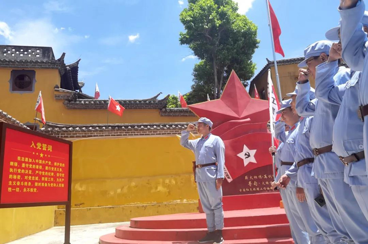 在红军长征柯渡纪念馆前,全体党员庄严地举起右手,重温入党誓词。12句誓词字字千钧,明确了党员对党组织和党的事业所应承担的政治责任,让大家铭记入党初心,践行党员承诺,在工作中不断进取,不懈奋斗。