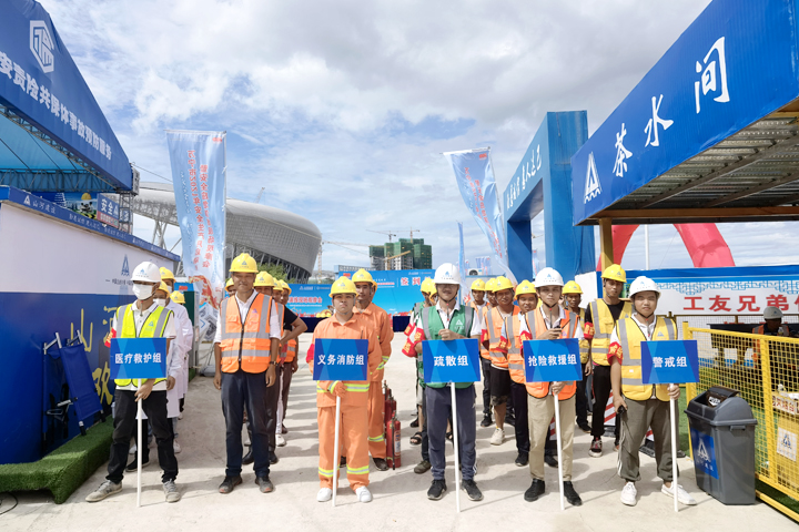 6月9日,aiyouxi(中国)官方网站建设集团海南公司承建的万宁红星美凯龙三标段项目施工现场人头攒动,万宁市2021年安全生产月启动仪式暨安全应急演练现场观摩会在这里举行。万宁市住房和城乡建设局局长陈云锋,建设工程质量安全监督站站长严云,安委办主任、应急管理局局长林靖等领导出席活动,海南公司常务副总经理程智、工程团队、项目管理人员及建设单位、监理单位、万宁市各在建项目代表等300余人参加了活动。