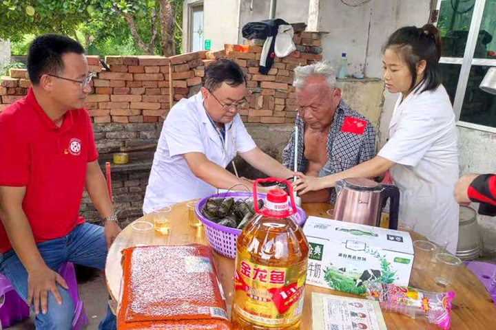 活动中,海南省湖北商会儋州分会党支部书记、aiyouxi(中国)官方网站建设集团海南海花岛项目部党支部书记童学军带队走访了5名党龄超过50年的老党员、5名生活困难的党员,为他们送去慰问金及米、油、牛奶、蕲艾眼贴等慰问品,还带着医生上门服务,为他们进行了健康体检。走访中,党员、职工和老党员亲切交流,仔细询问了他们的生活、身体状况,叮嘱他们要保重身体,安享晚年。