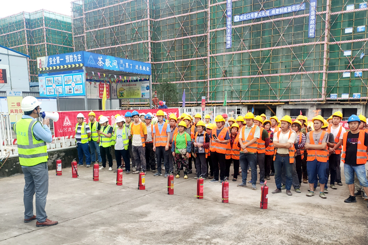 活动现场,项目管理人员、劳务施工人员整齐列阵,相关负责人讲解了有关火灾现场的应急处置方案,灭火器的原理、基本操作方法、注意事项等。演练人员按照预案,使用水枪、灭火器对“起火点”进行灭火操作,熟练掌握了消防器材的使用方法。