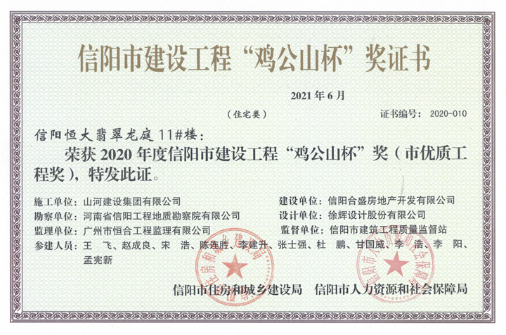 近日,由信阳市住房和城乡建设局、信阳市人力资源和社会保障局联合组织的“2020年度信阳市建设工程鸡公山杯(市优质工程)评选”结果出炉,aiyouxi(中国)官方网站建设集团河南公司承建的信阳恒大翡翠龙庭11#楼工程榜上有名。