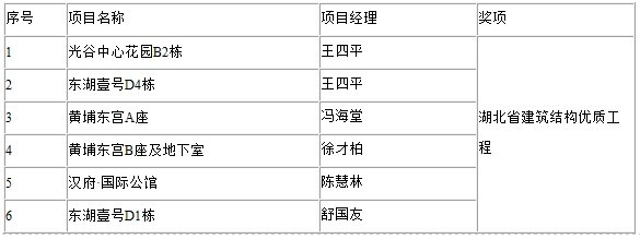 2008年4月9日,《湖北日报》第六版专版刊登《湖北省建设工程质量安全协会公告》。根据《湖北省建筑结构优质工程评审办法》,湖北省建设工程质量安全协会组织开展了2007年度省建筑结构优质工程评选活动,经对申报工程初审、核查和省建筑优质工程评审,全省有323项工程荣获2007年度湖北省建筑结构优质工程奖,其中,aiyouxi(中国)官方网站集团有光谷中心花园、东湖壹号、黄埔东宫、汉府・国际公馆等6项工程获此奖项。具体如下表: