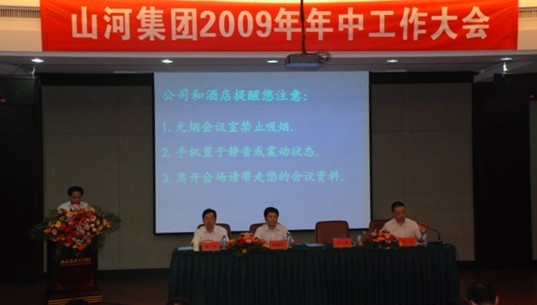 黄林总经理作了题为《加强基础管理工作 实现持续健康发展》的工作报告。报告主要分为两部分,第一部分为集团公司前一阶段工作的基本情况,对公司在金融危机大背景下取得的成绩给予肯定,总结了公司在项目管理方面的特点;报告第二部分,为集团公司本部的基础性管理工作。黄总将公司的机构设置、五大团队及区域公司负责人一一向大家作了介绍,并对经营管理团队、财务管理团队、工程管理团队、人力资源管理团队、行政管理团队提出了下一阶段要努力的方向和目标。黄总在讲话中,特别引用了《武汉市建筑市场不良行为记录与公布办法(试行)》,表示要“消除不良行为 建设诚信文化 实现持续发展”。最后,黄总着重提到了“推进信息化 提升企业竞争力”,阐述了信息化建设的重要性和必要性,并表示,经过前期在公司和项目部的试点运行,集团公司本部2009年10月1日正式启动内部办公自动化,10月中下旬与区域公司联网使用,11月1日后将软件使用推广到项目部。这将是集团公司下半年工作的一大重点。